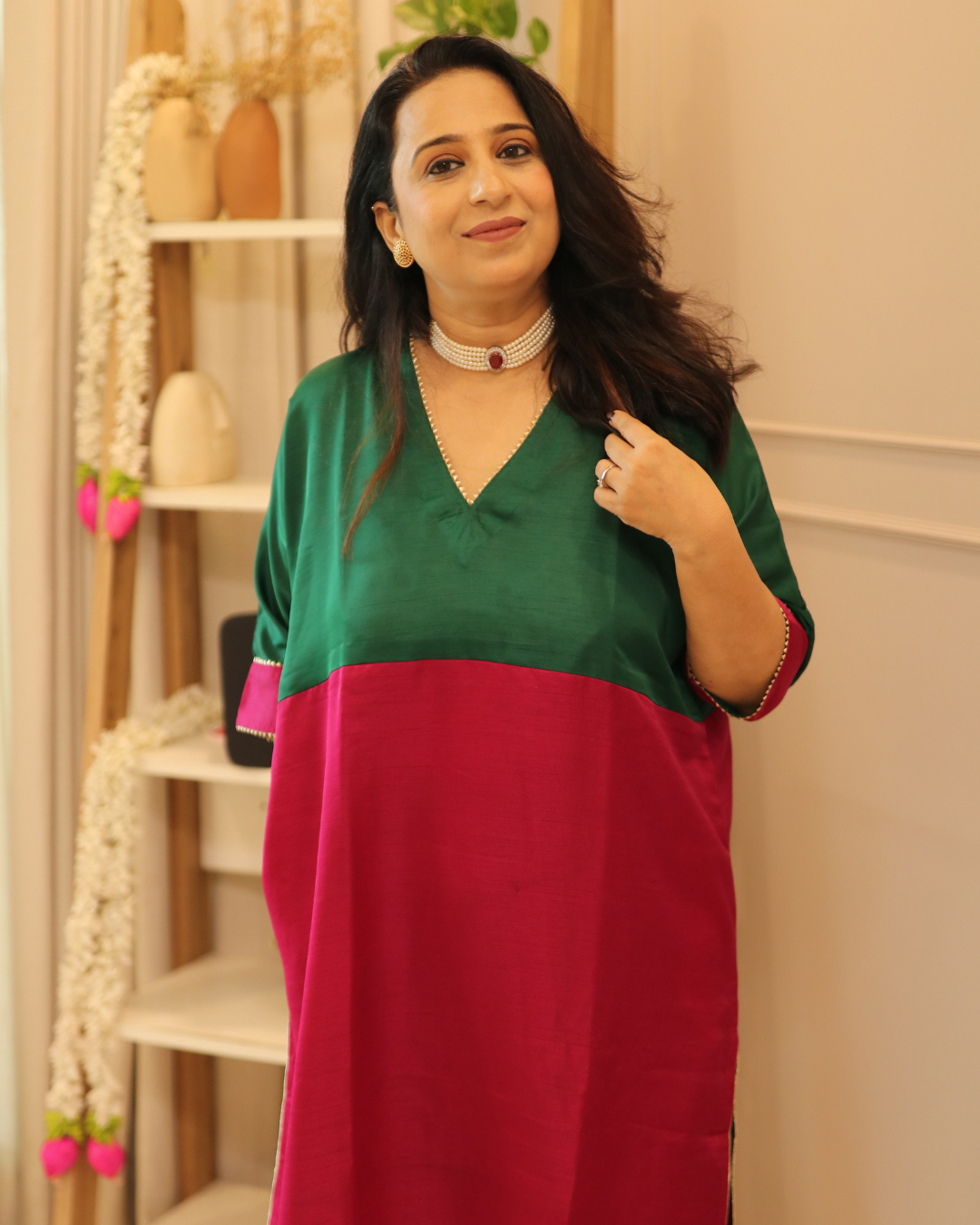 A striking two-tone festive dress in semi-silk, Vira blends elegance with ease. The deep green upper half pairs beautifully with the vibrant pink lower panel, finished with delicate detailing on the sleeves. Lightweight yet luxurious, it’s perfect for festive gatherings and beyond.