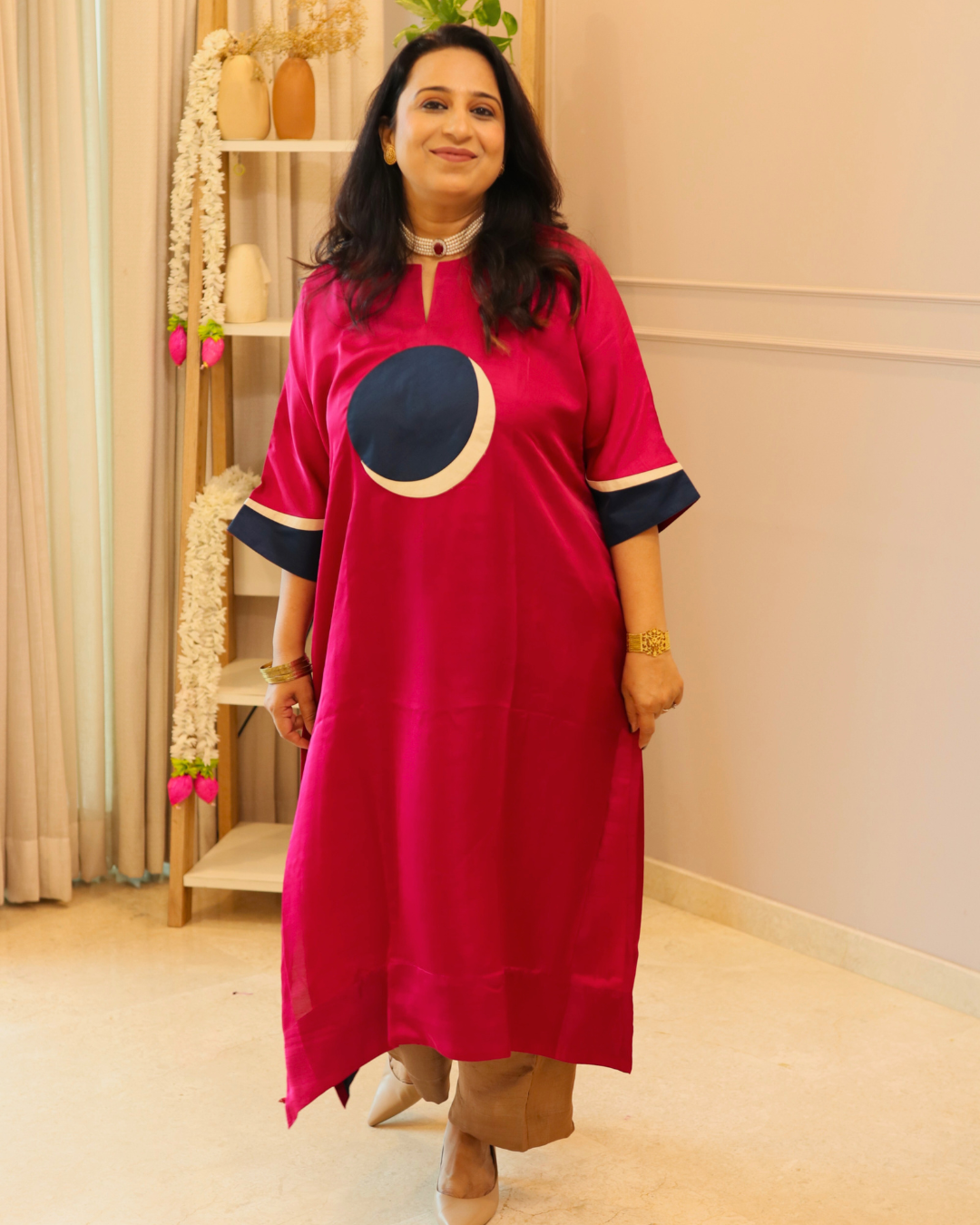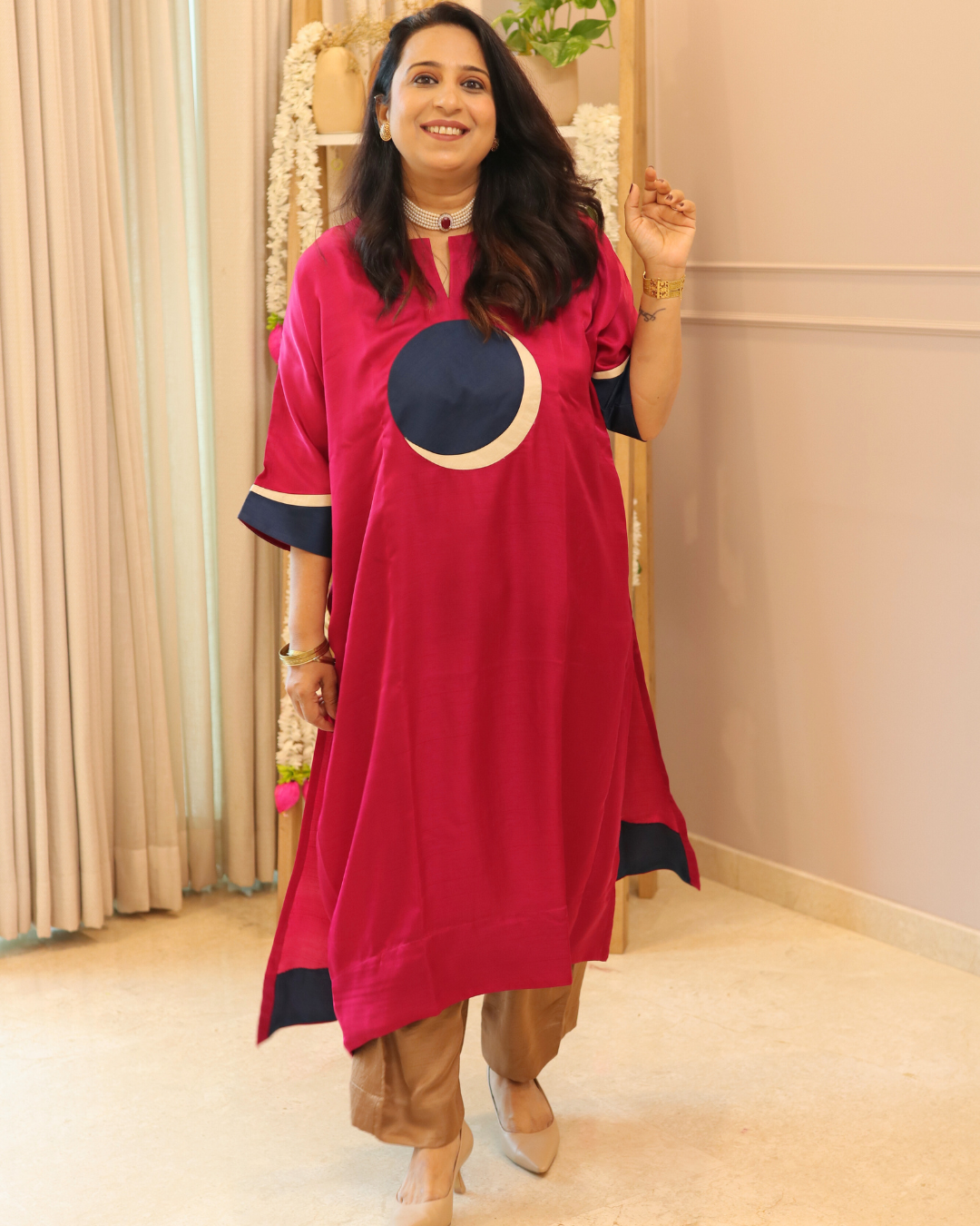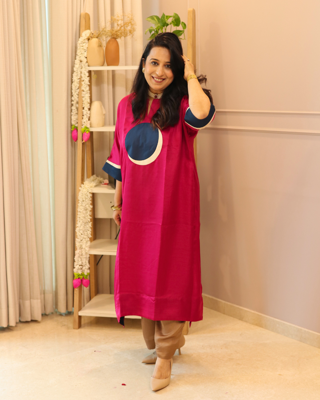 Vibrant magenta silk kurta with a navy and cream circle design. Styled with tan pants, ideal for celebrations and casual ethnic outings. The playful color contrast adds a touch of charm to your festive wardrobe.