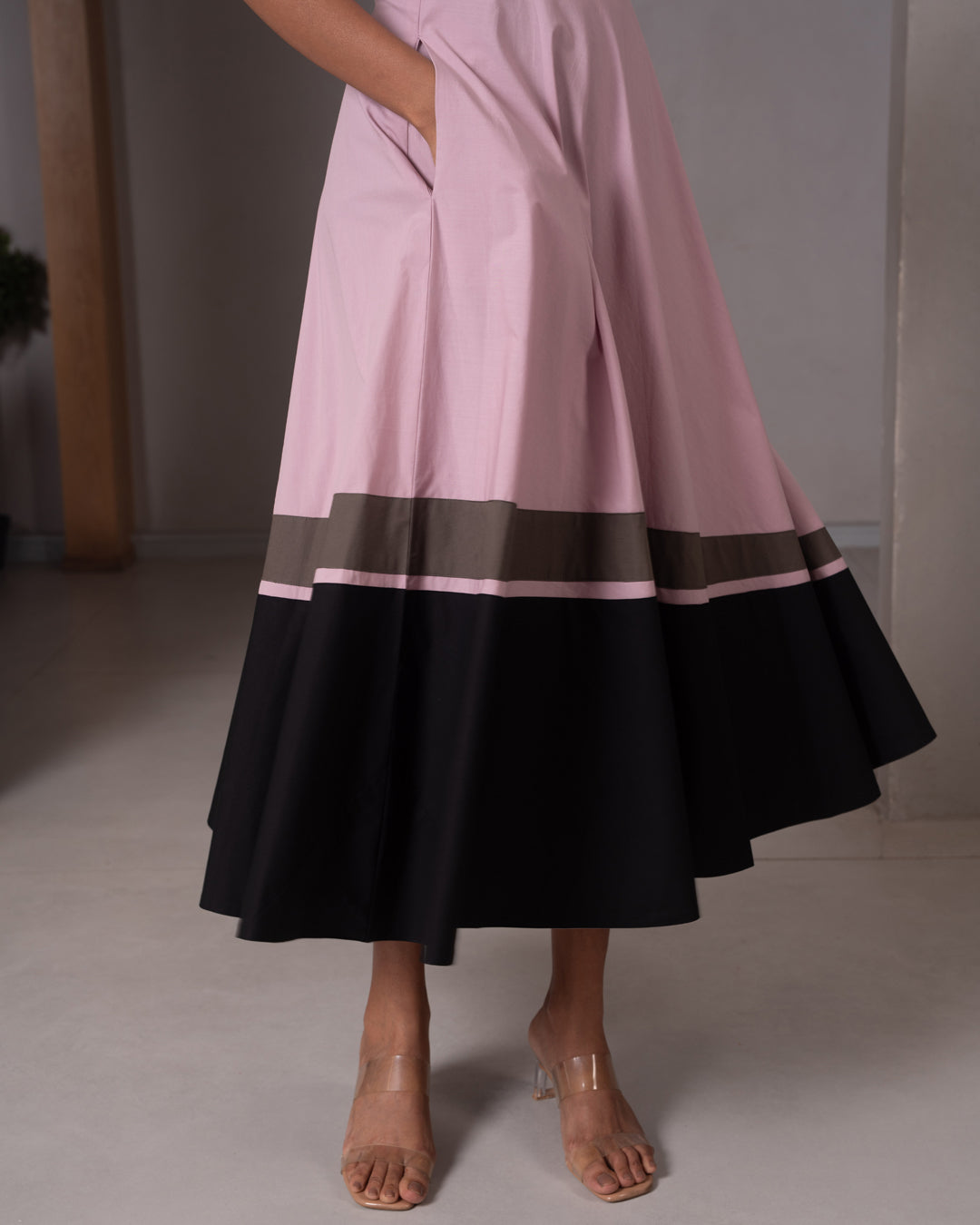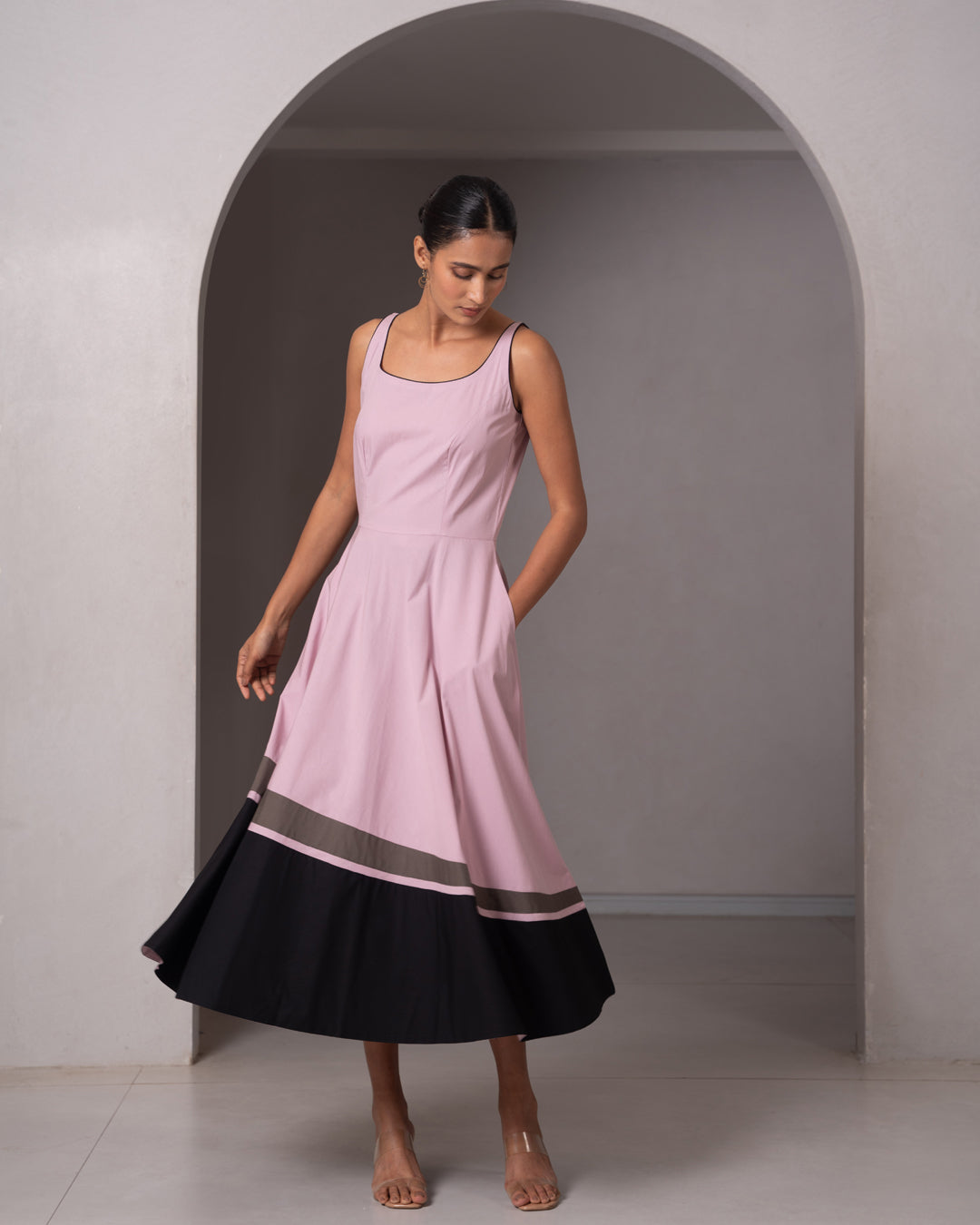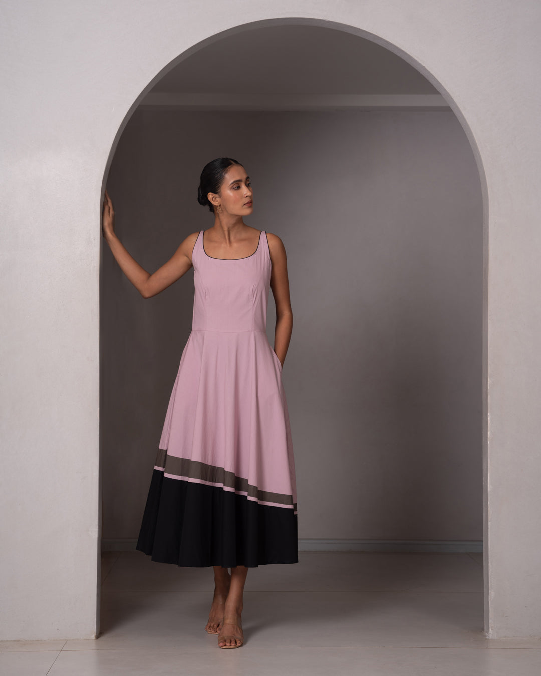 A graceful sleeveless midi dress in Mauve pink with a clean, fitted bodice and fluid flare. The contrast black hem is accented with subtle Soft grey stripes for a modern edge. Effortlessly elegant, it moves beautifully and suits both day and evening wear.