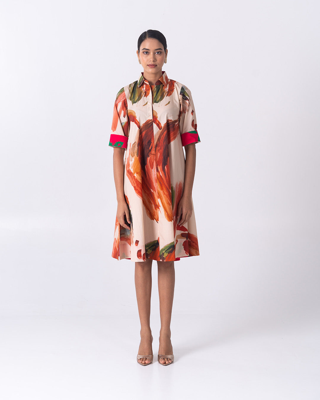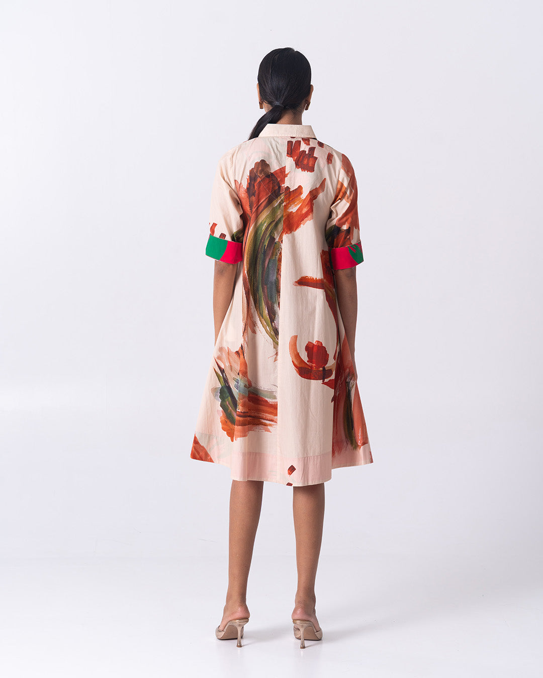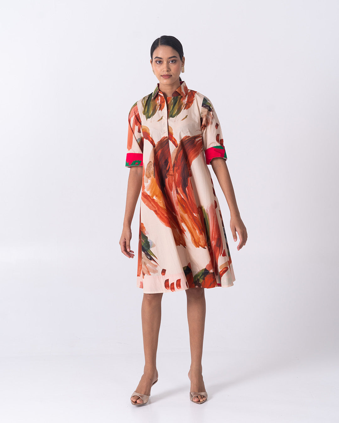 Noa dress brings brushstrokes to life in warm earthy tones of orange, rust, and green. The A-line silhouette with a shirt collar and contrast detailing on the sleeve cuffs blends ease with structure. Each stroke flows freely across the fabric, creating a wearable piece of art. Bold yet effortless — Noa celebrates color in motion.
