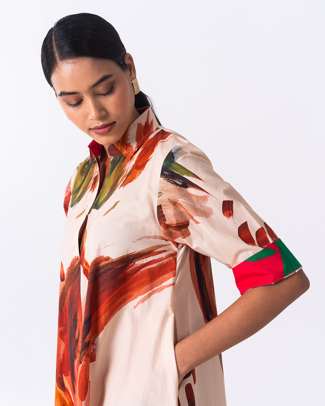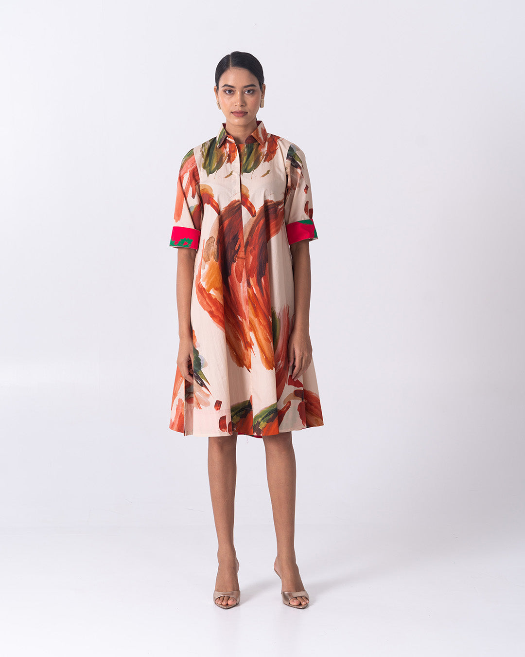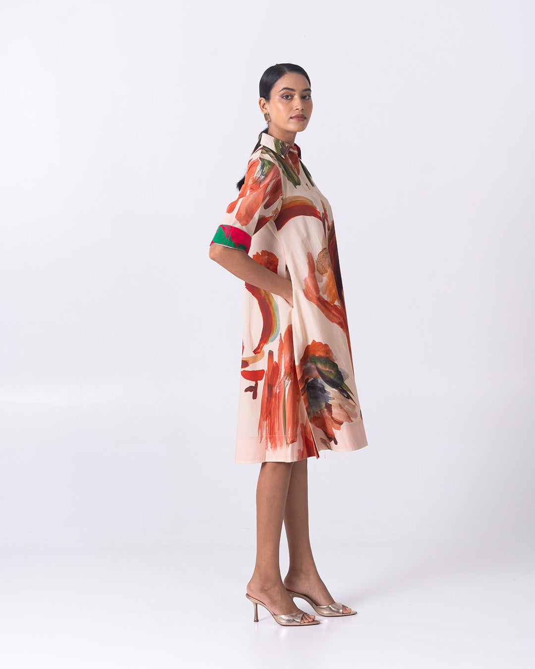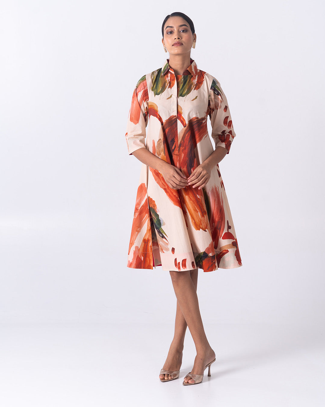 Noa dress brings brushstrokes to life in warm earthy tones of orange, rust, and green. The A-line silhouette with a shirt collar and contrast detailing on the sleeve cuffs blends ease with structure. Each stroke flows freely across the fabric, creating a wearable piece of art. Bold yet effortless — Noa celebrates color in motion.