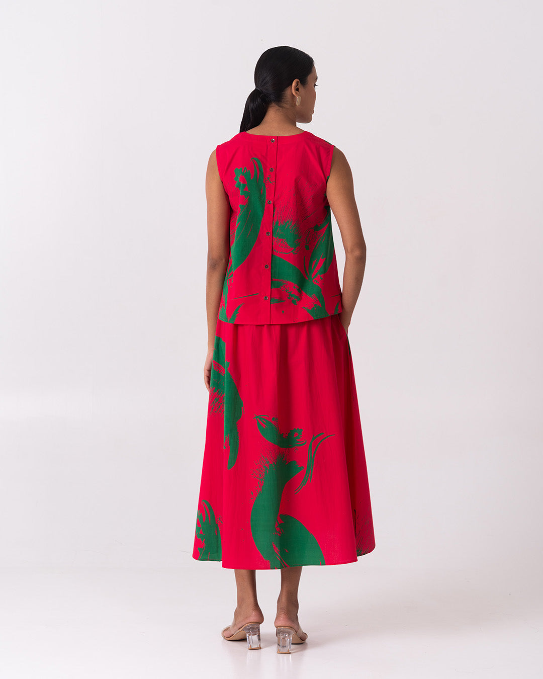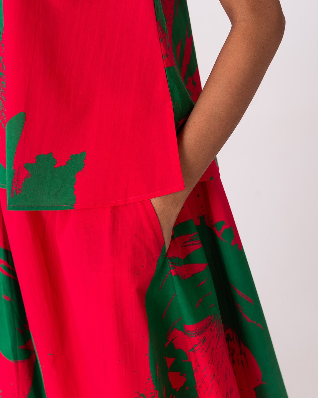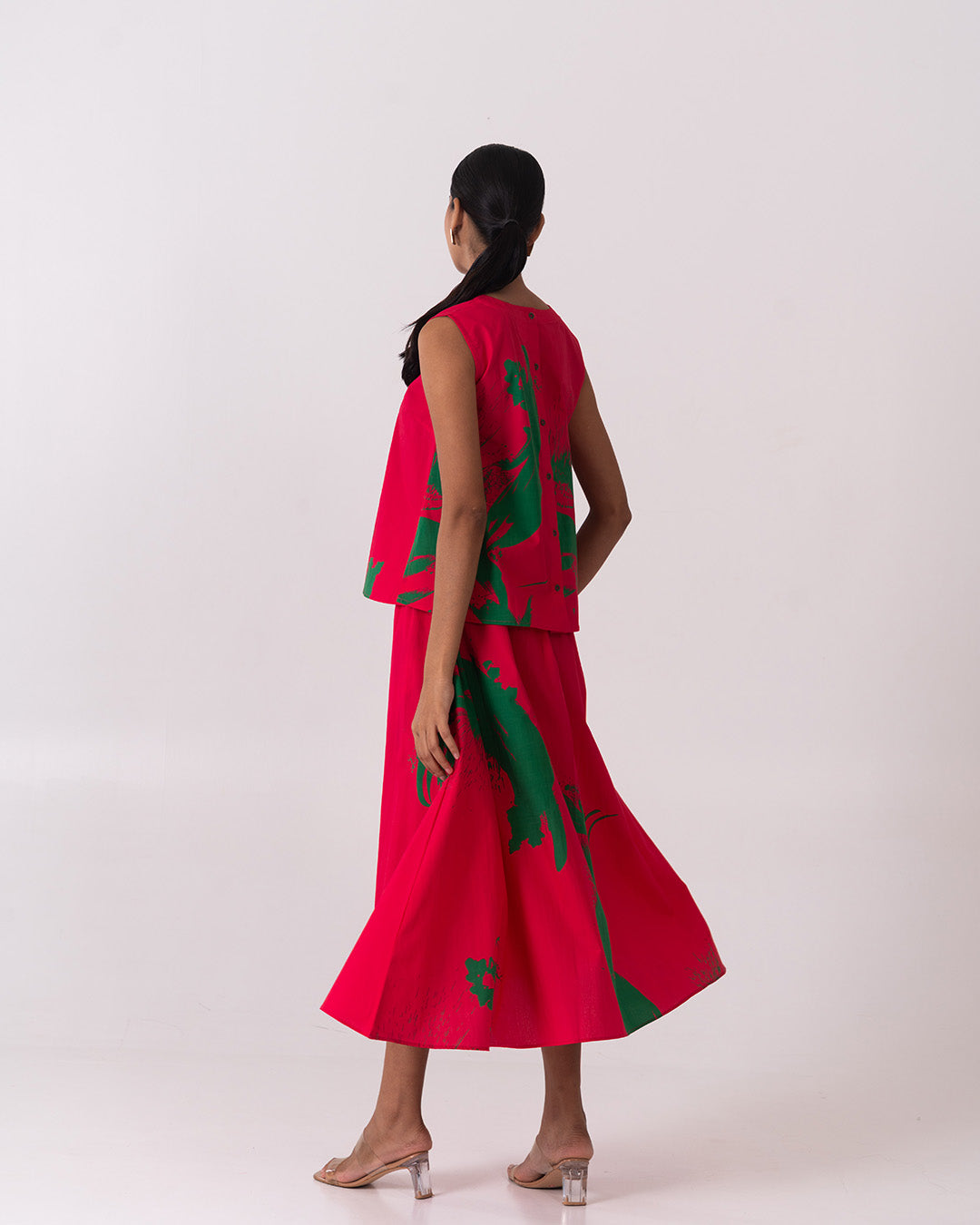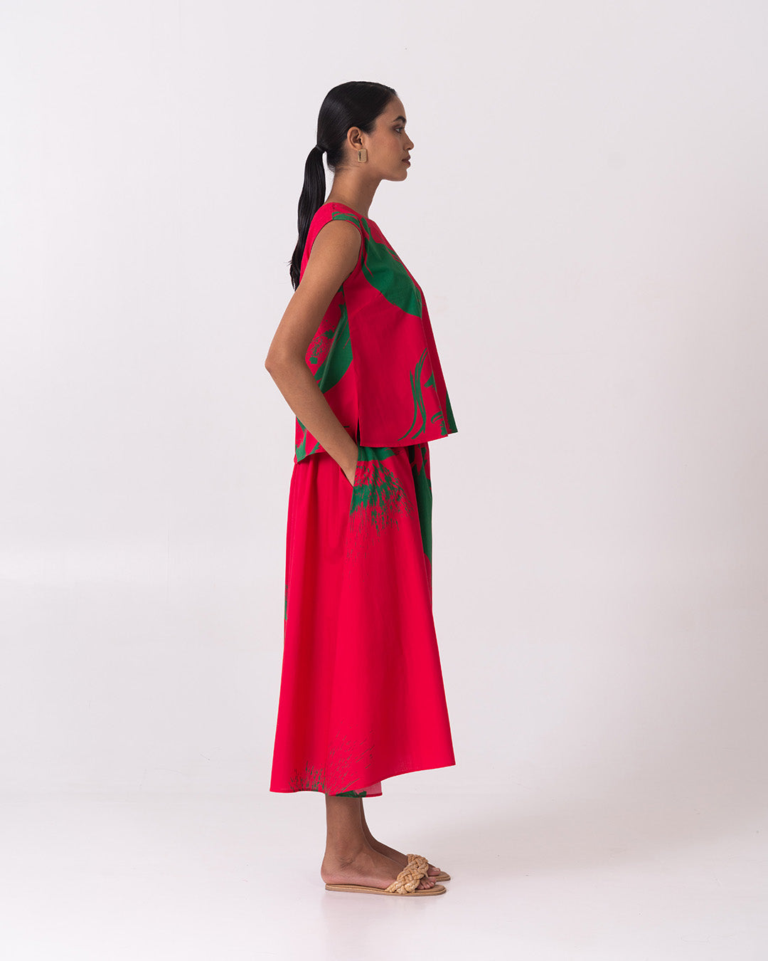Fluid Set pairs a crew-neck top with a flared skirt featuring a full elastic waist for easy comfort. The dark pink base comes alive with green brushstroke prints, capturing the spontaneous flow of paint in motion — expressive, free, and effortlessly chic.