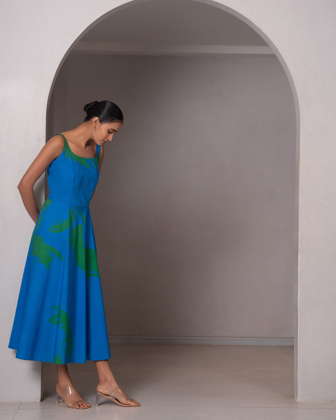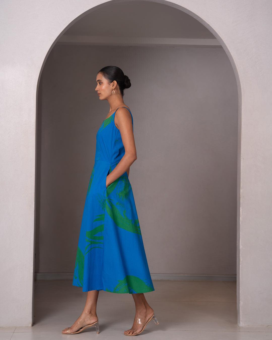 Bold yet timeless, the Muse Dress in cobalt blue celebrates movement and color. With its broad neck, sculpted bust fit, and graceful flare, it flatters while flowing effortlessly. The green brushstroke contrast hem lends a painterly edge — a perfect blend of structure, softness, and artistic energy.