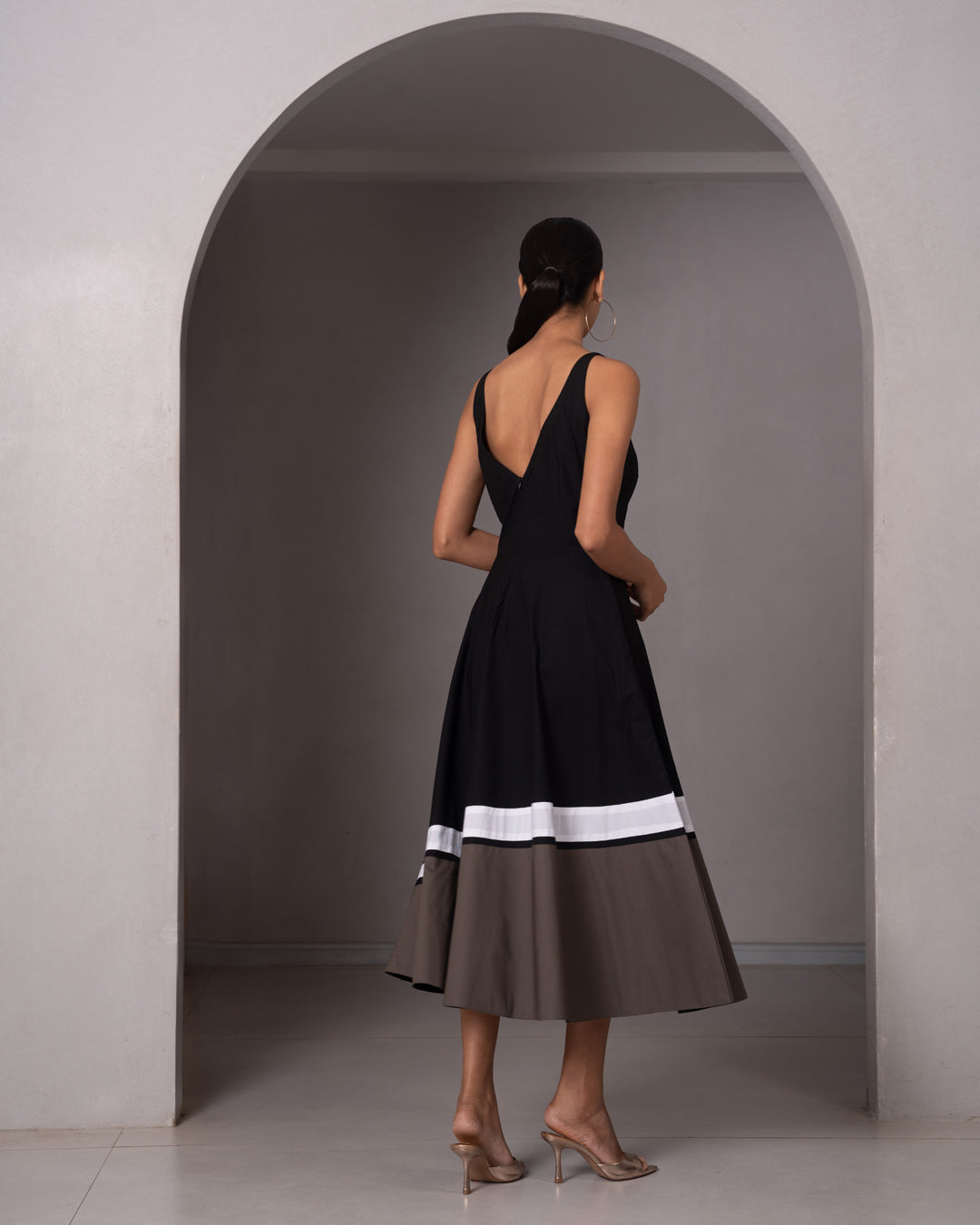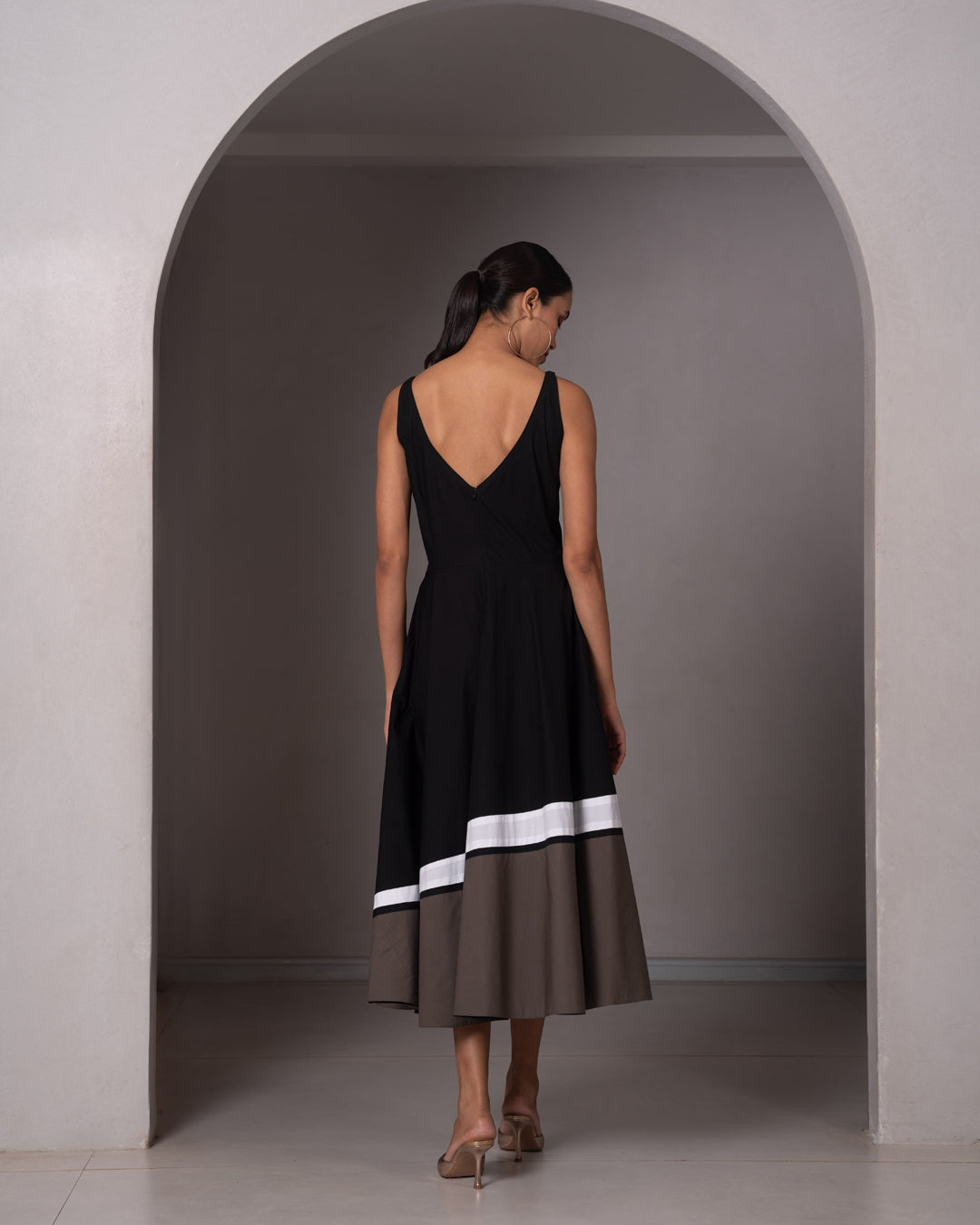The Muse Dress is a timeless black midi silhouette designed to move with effortless grace. Crafted with a sleeveless, clean neckline bodice, it flares into a fluid skirt that creates a beautiful swirl with every step. The hemline is elevated with a striking contrast soft grey panels finished with crisp white stripe detailing adding depth and modern charm. Elegant yet understated, balances classic sophistication flair, making it perfect for evening soirees, gallery visits, or refined day outings.