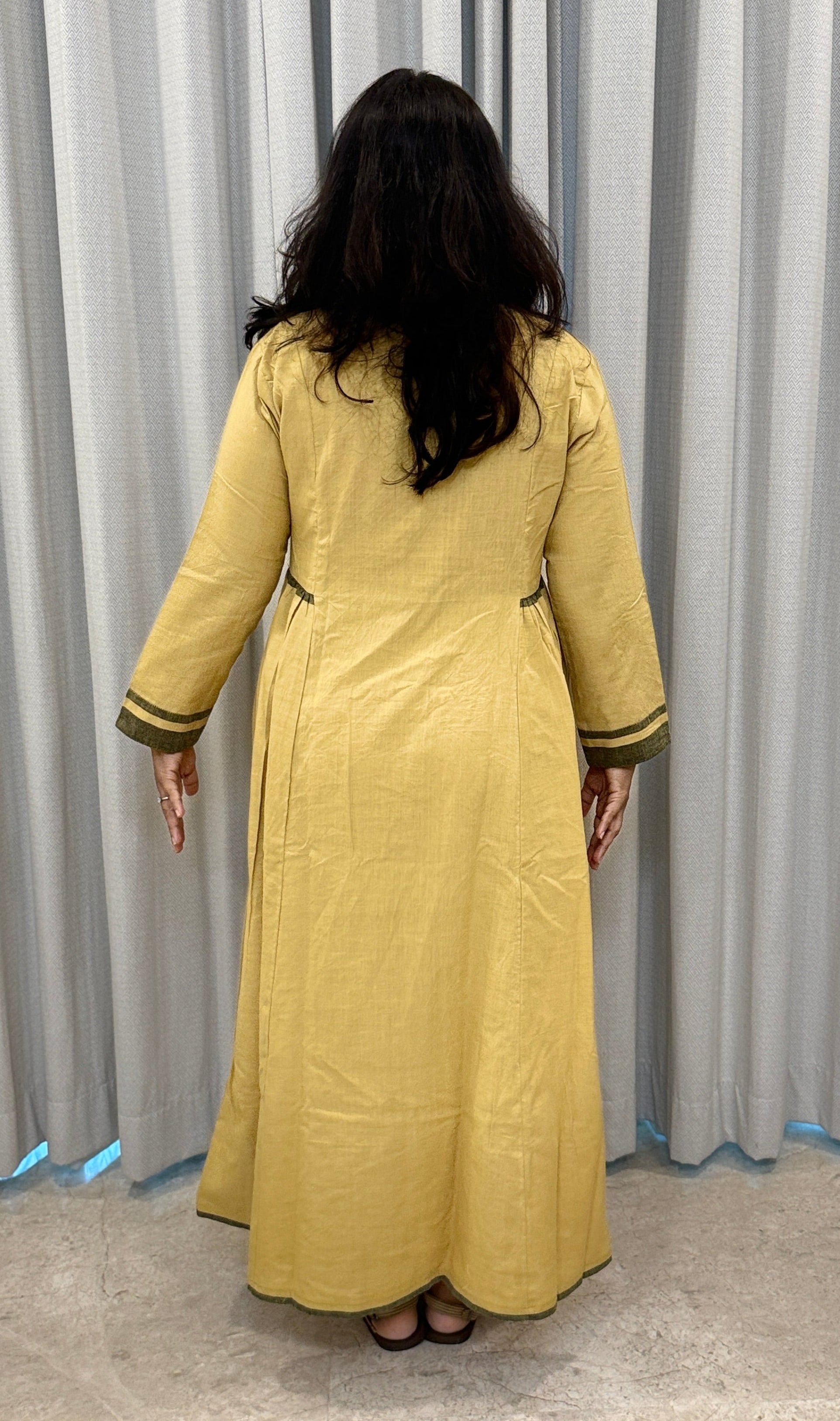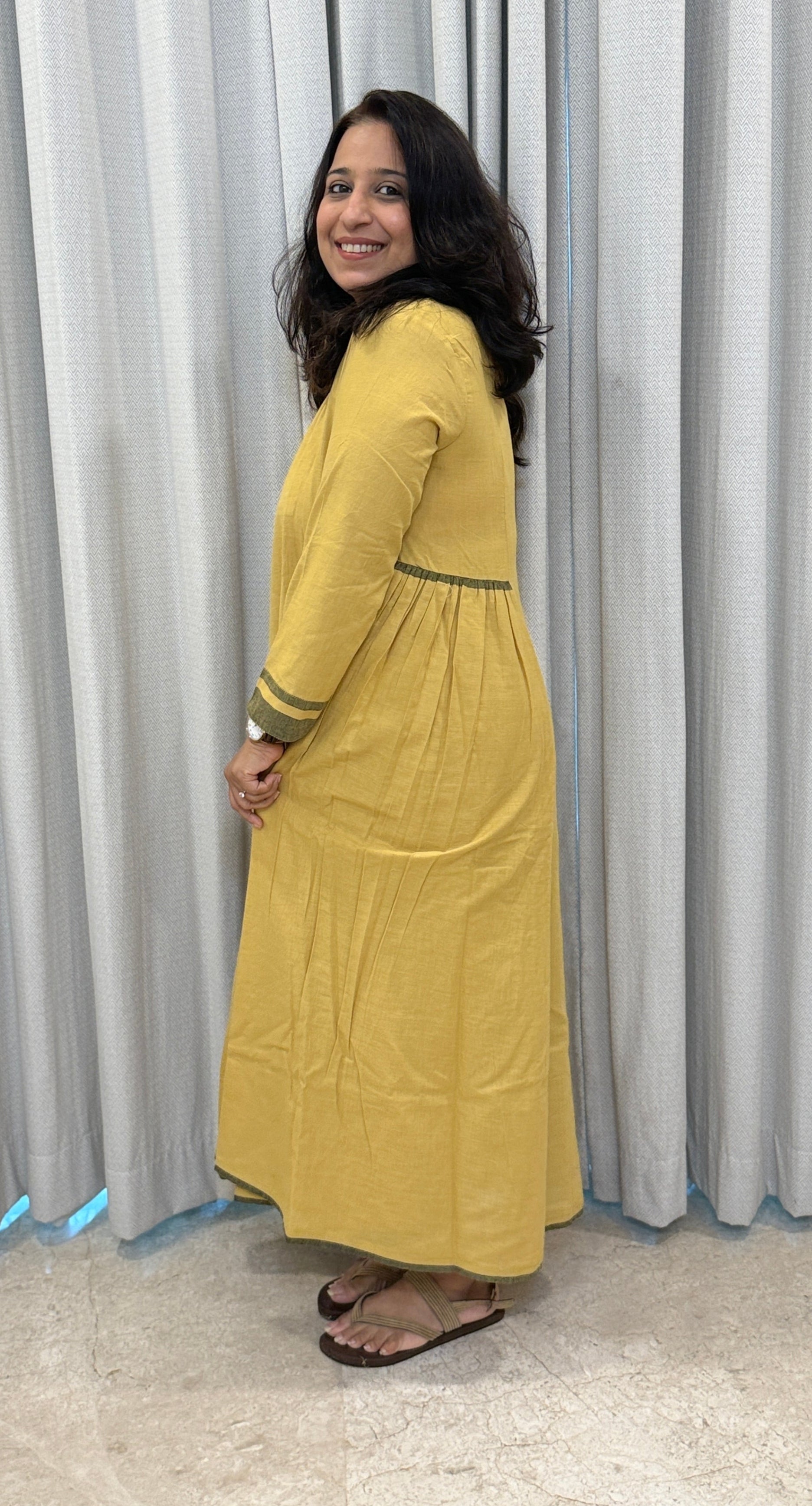 This yellow dress features a relaxed, free-flowing silhouette that gently skims the body without clinging. Cut for ease and grace, it falls in a soft, straight line from shoulder to hem, offering a sense of quiet elegance. The fluidity of the fabric, likely enhanced by a bias-inspired drape, allows for natural movement, while the minimal shaping at the waist keeps the form breathable and unrestrictive. Finished with subtle sleeve detailing and a clean hem, the silhouette embodies effortless charm — blooming softly with every step.