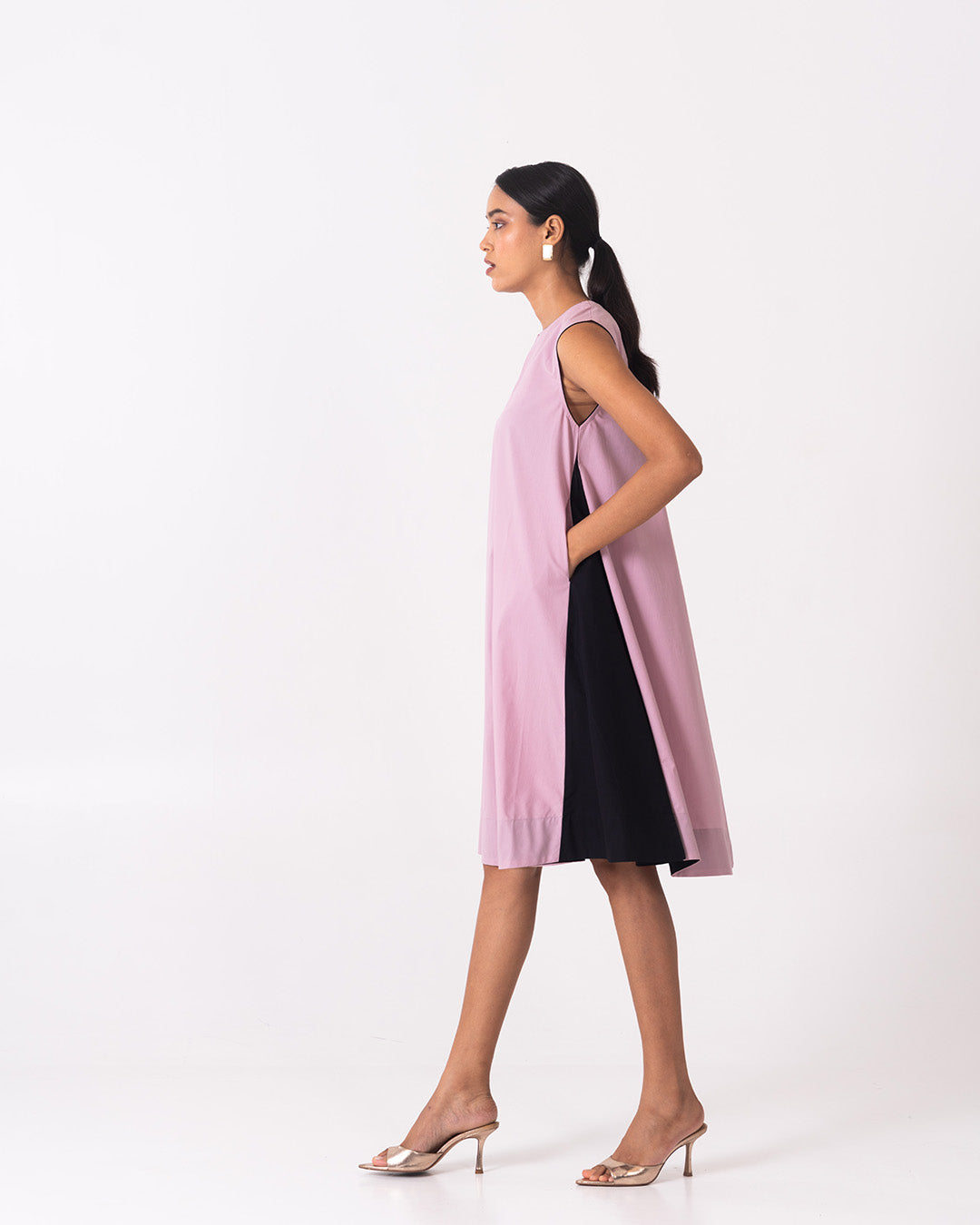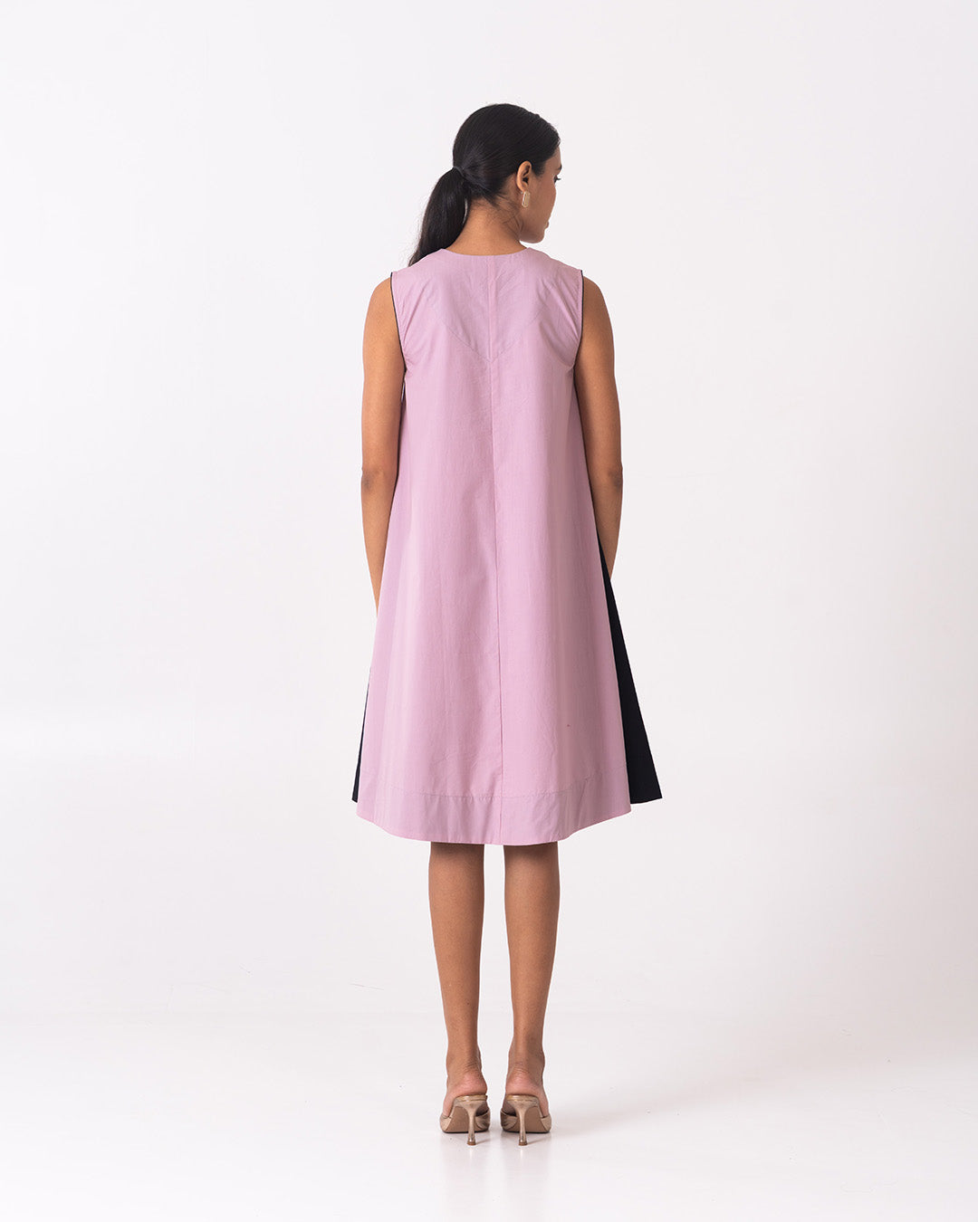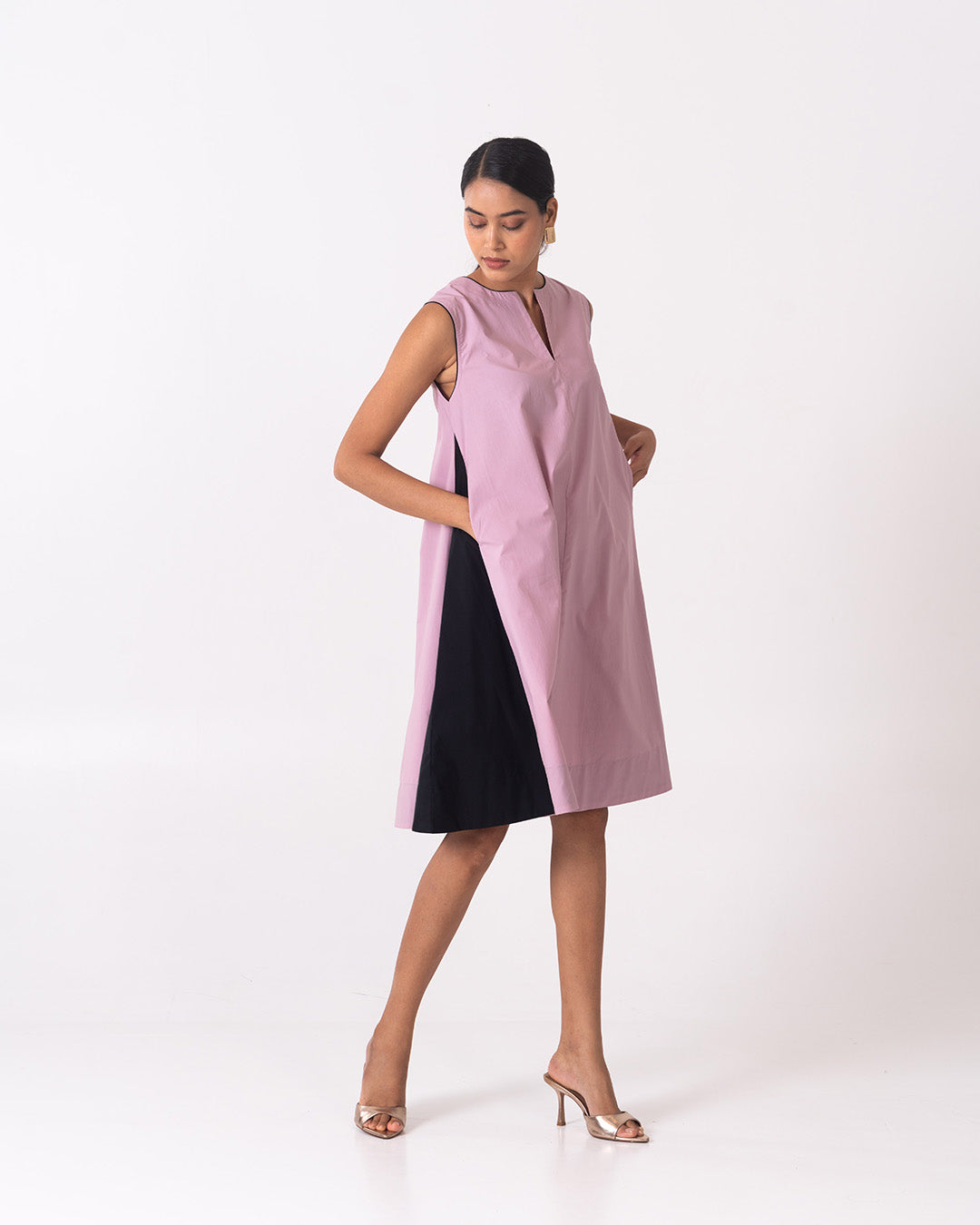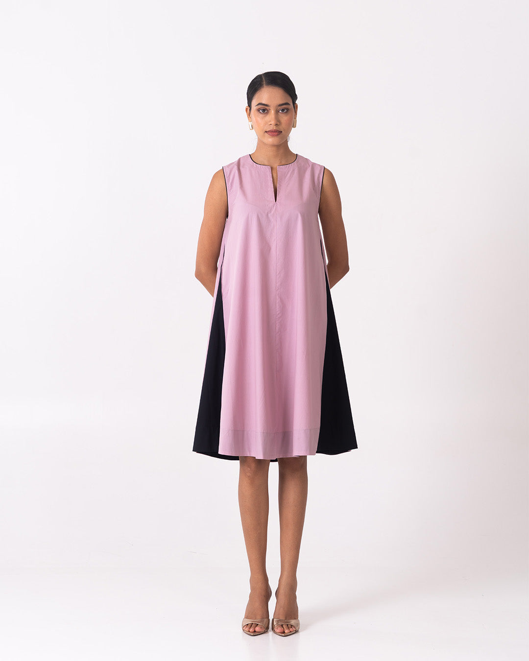 The Noa dress in soft mauve pink features a clean, sleeveless silhouette with a subtle V-slit neckline for understated elegance. Designed with a relaxed A-line fall, it is elevated by contrasting black side panels that add depth, movement, and a flattering visual balance. Minimal yet contemporary, this dress is perfect for effortless daywear or polished evening styling.