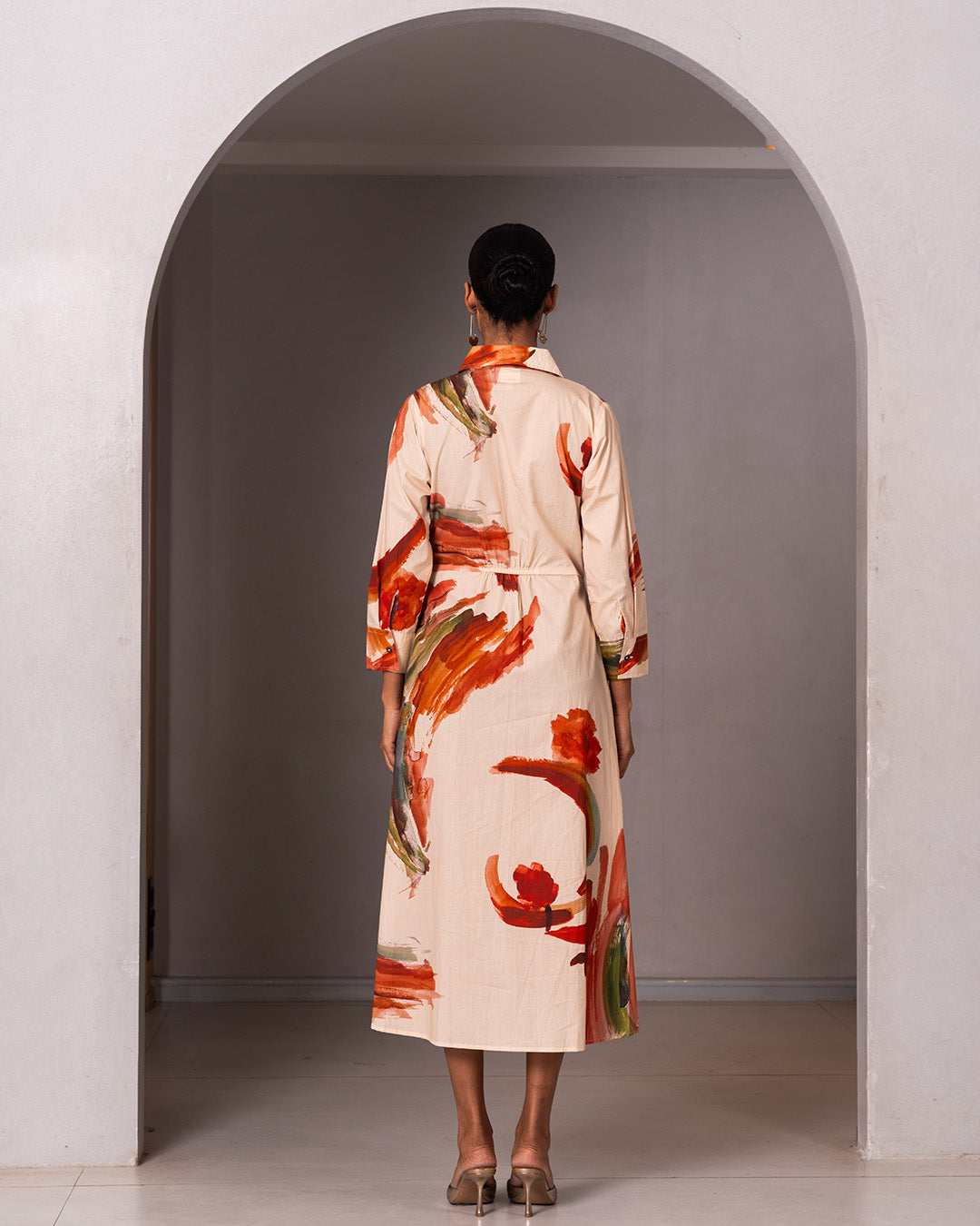 The Sculpt Dress redefines elegance through artistic movement. Featuring a wrap-style bodice and a flared midi silhouette, it’s adorned with hand-painted brushstroke prints in earthy tones of rust, orange, and green. The structured collar and waist-defining detail add polish, while the side pockets keep it effortlessly functional. A perfect harmony of art and form — expressive, confident, and fluid.