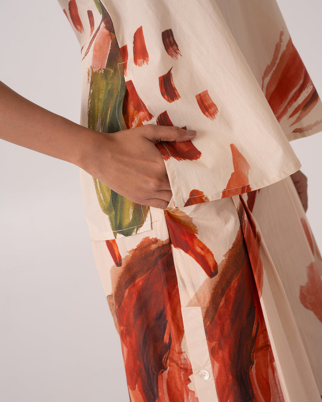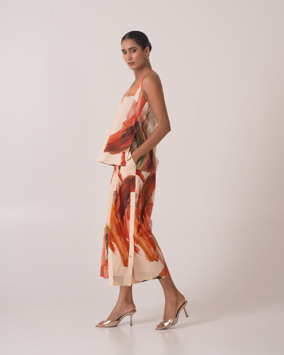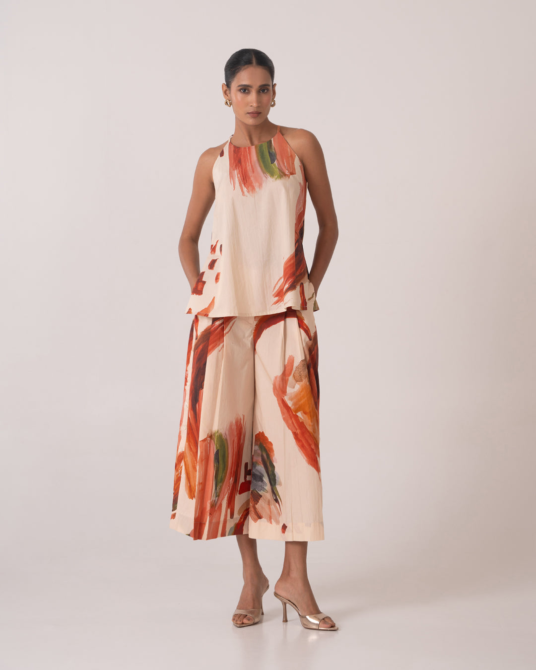 An effortless co-ord featuring a breezy halter-neck top and wide-legged culottes. Crafted in soft cotton with abstract brushstroke prints in earthy orange, green, and coral tones — this set flows with movement and modern ease. Perfect for days when comfort meets statement style.