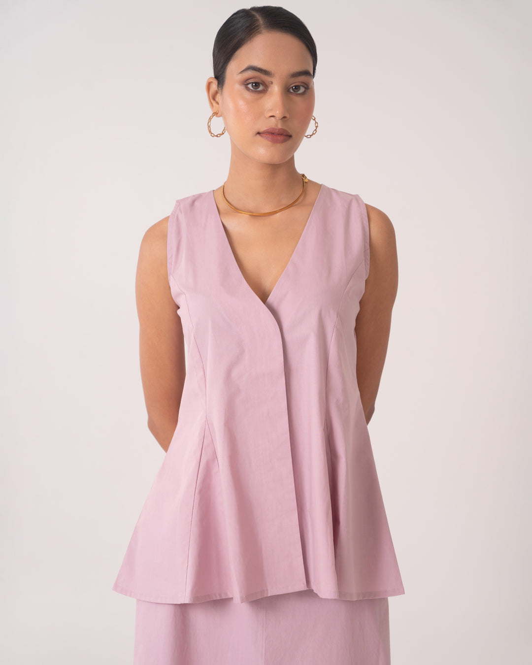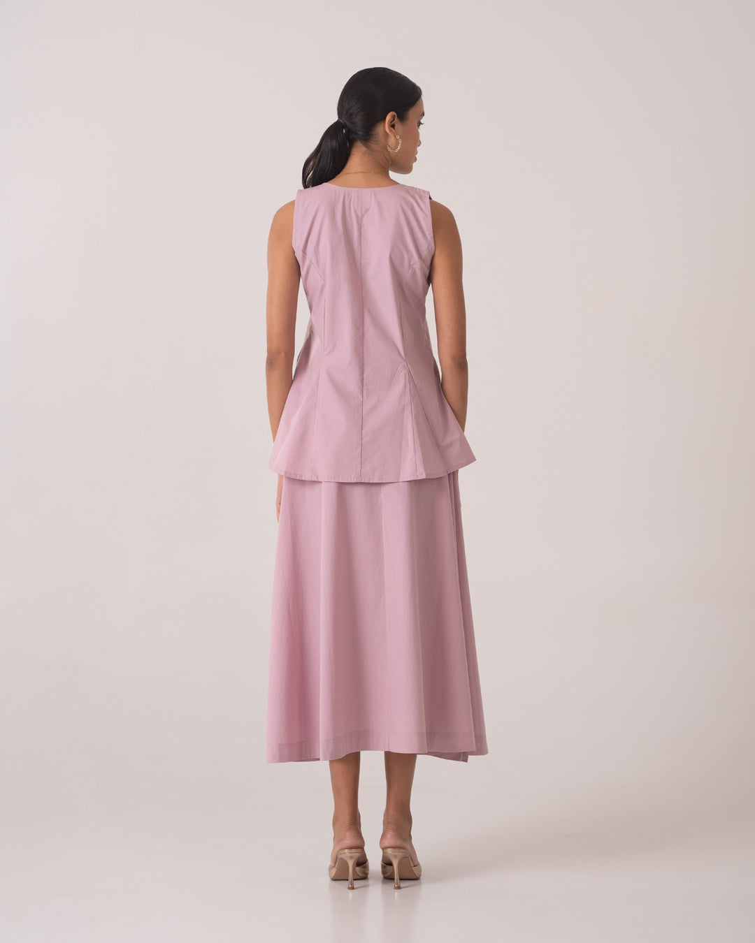Mauve pink co-ord set crafted in a lightweight, breathable fabric. The sleeveless V-neck top features clean panelled pleats that create a relaxed yet structured silhouette, finished with a subtle overlap detail. Paired with a flowy A-line midi skirt designed with a comfortable fit and delicate side button detailing, this set offers graceful movement and understated elegance—ideal for workdays, brunches, or refined casual outings.