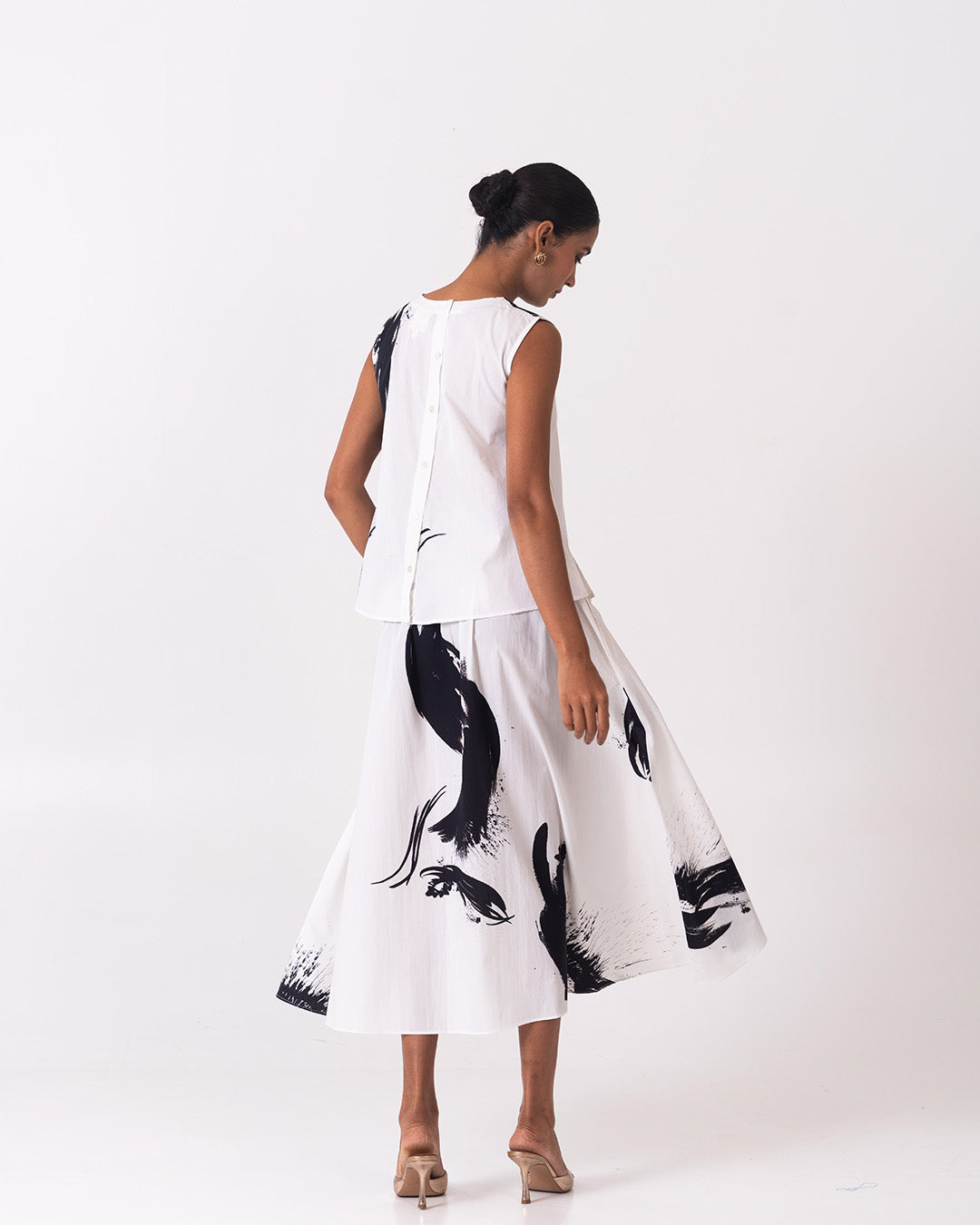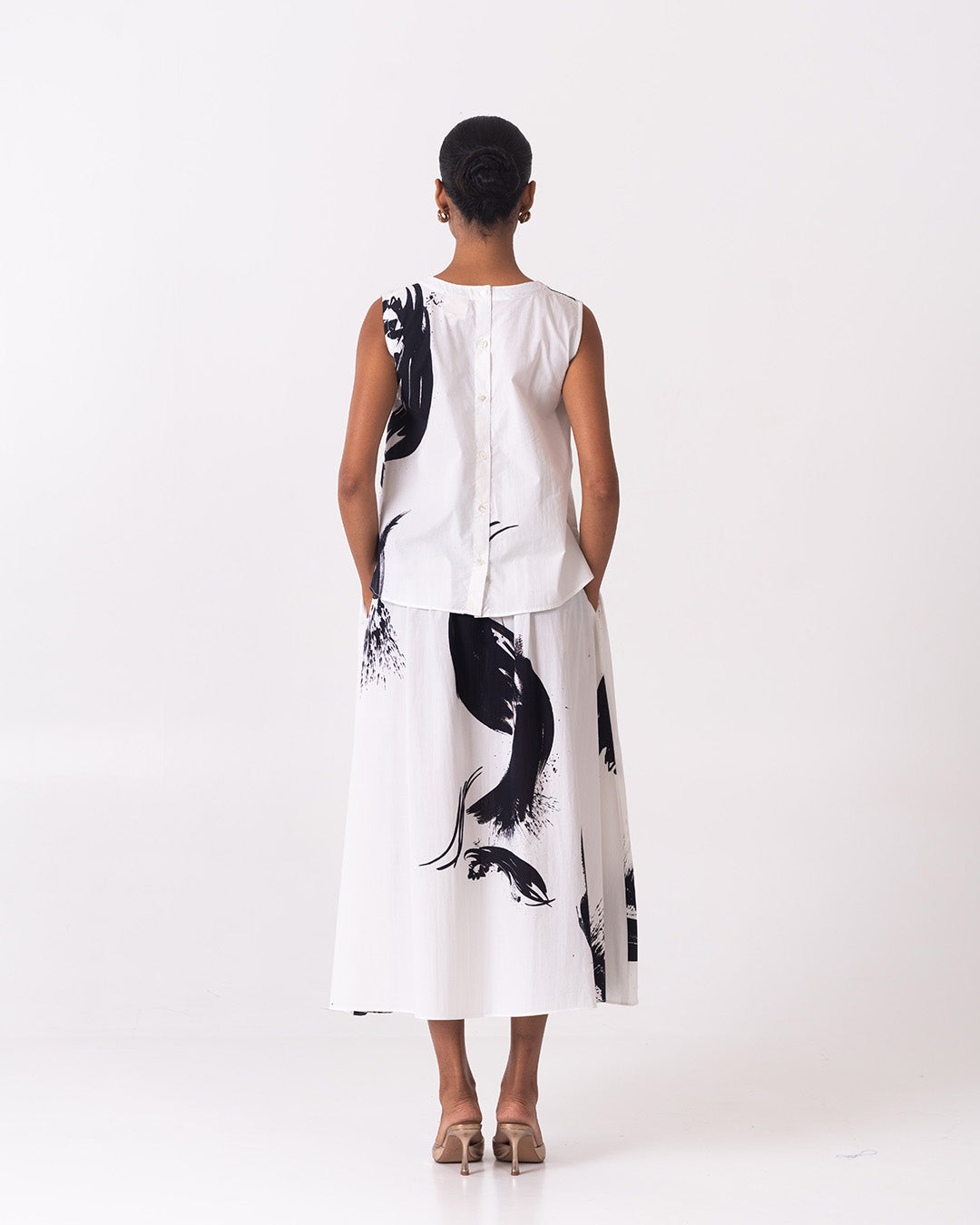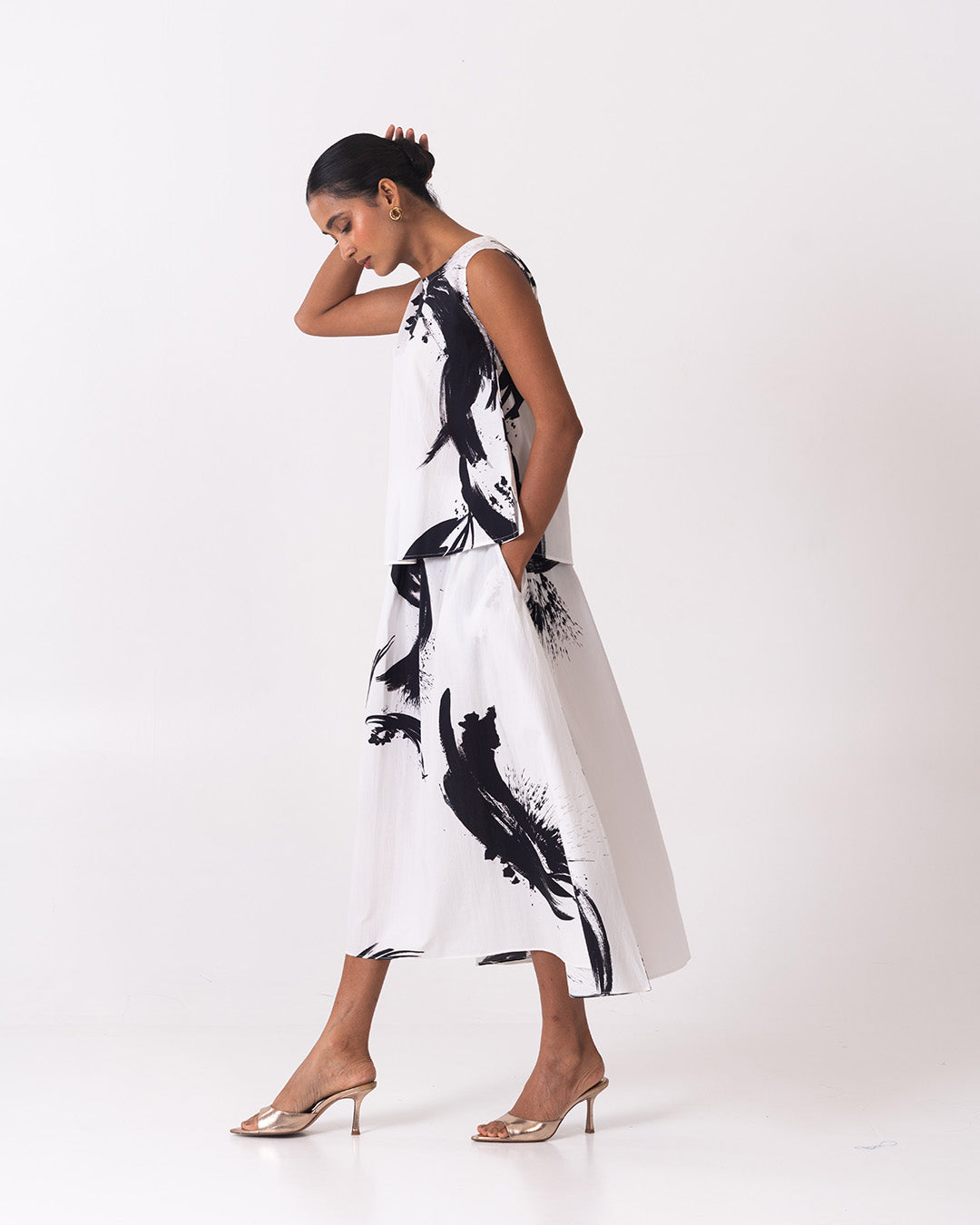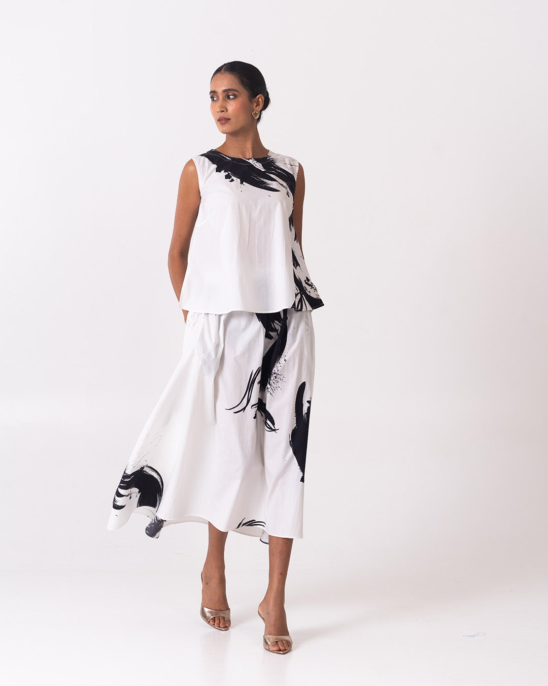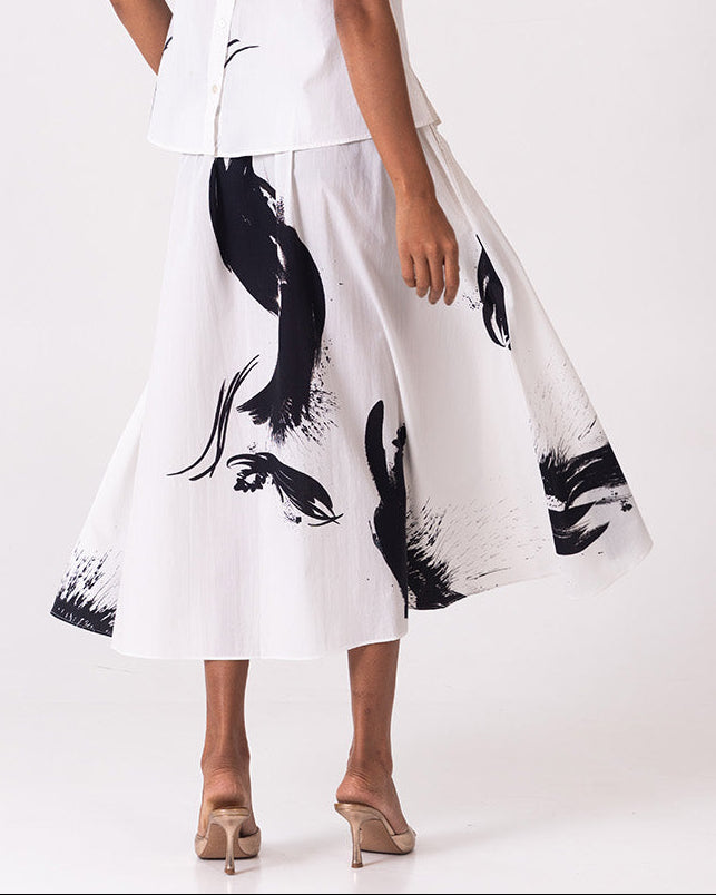 The Fluid Set is an effortlessly elegant monochrome co-ord featuring a sleeveless, easy-fit top paired with a softly flared midi skirt. Crafted in a lightweight, breathable fabric with bold black brushstroke prints on a clean white base, this set flows beautifully with movement, offering comfort, versatility, and a refined statement for elevated everyday or resort-inspired styling.