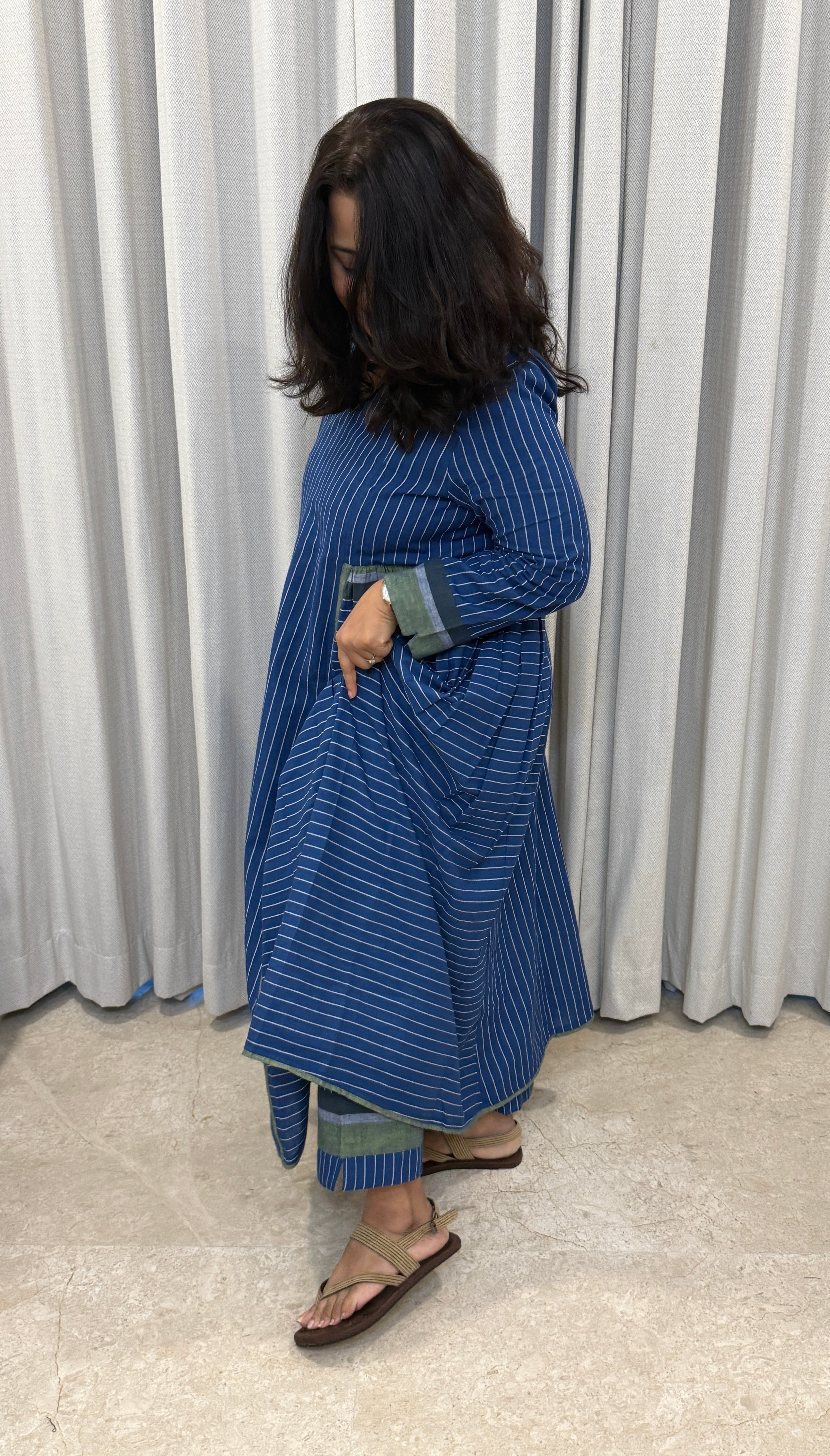 This is a coordinated set featuring a striped indigo A-line tunic paired with matching straight pants. The tunic comes with contrast detailing in muted olive and navy tones on the side panels and sleeve cuffs, adding a subtle highlight to the overall look. The straight pants, designed in the same fabric, feature a comfortable drawstring waist and are finished with a double border detail at the hem, mirroring the tunic's accents. Together, this co-ord set blends comfort with understated elegance, perfect for everyday wear with a refined touch.