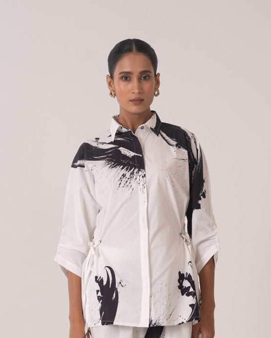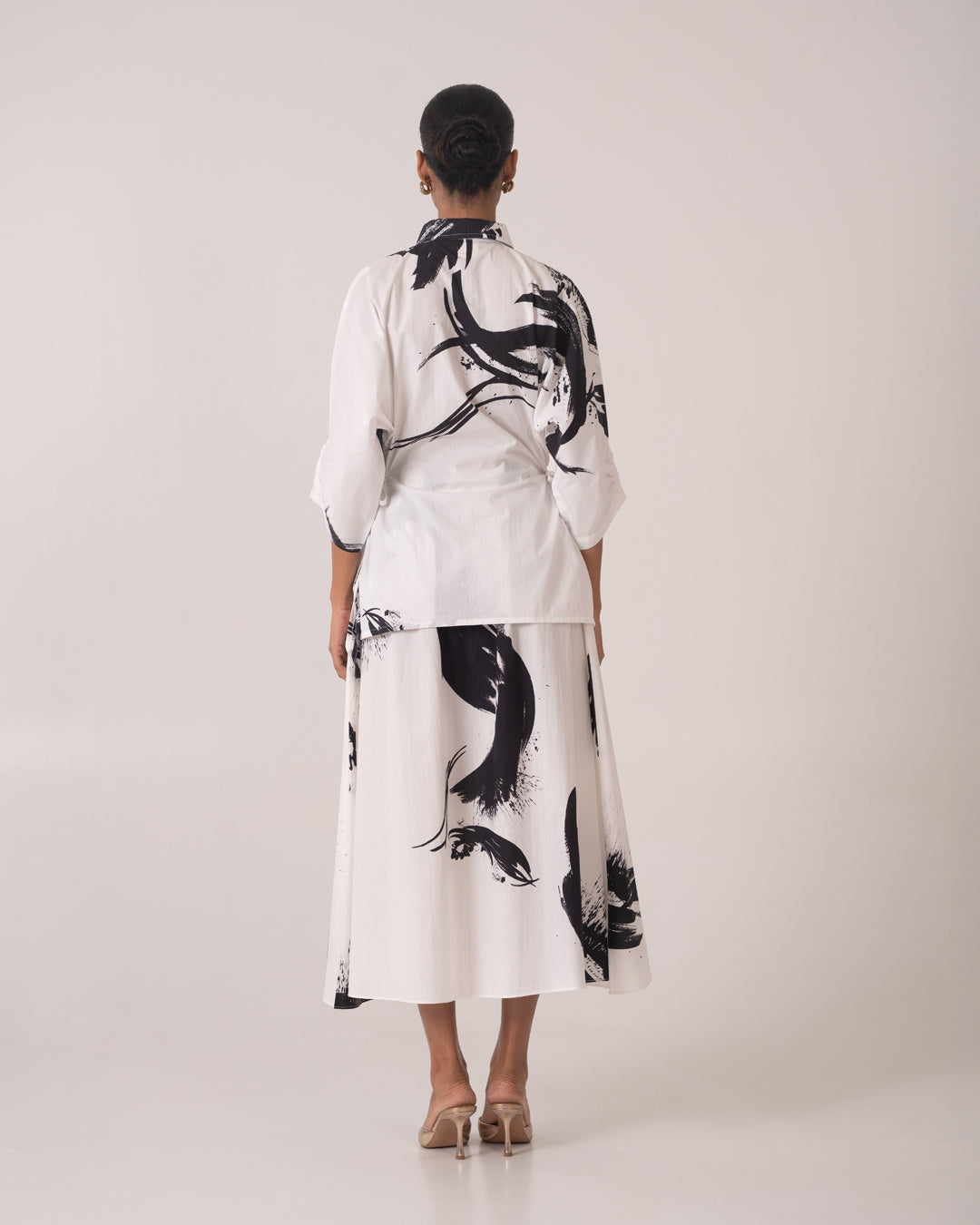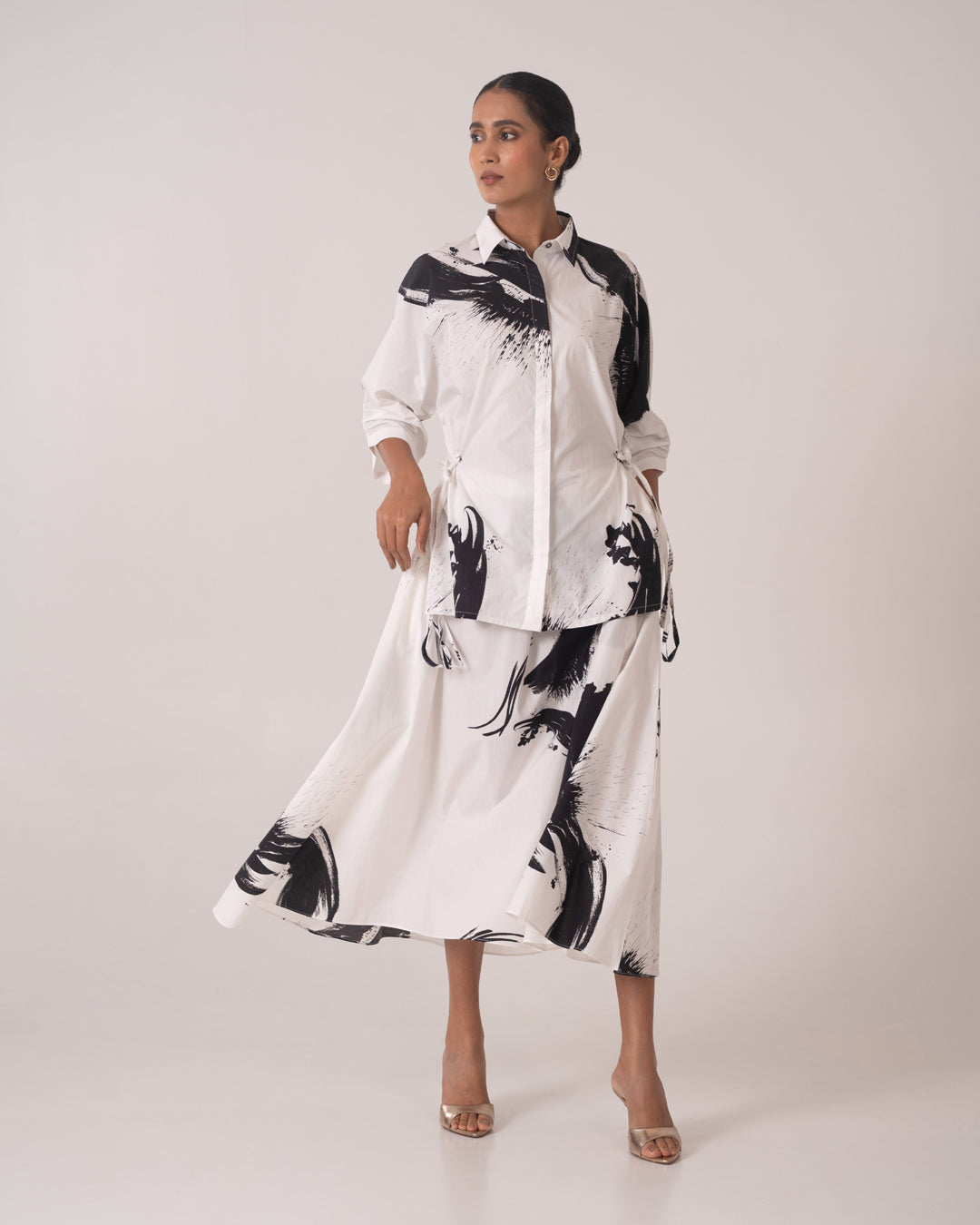 Tone Set is a modern monochrome co-ord featuring an oversized button-down shirt with adjustable side tie-ups and a fluid, flared midi skirt, finished in bold black-and-white brushstroke prints. Crafted in a lightweight, breathable fabric, it offers effortless movement and comfort while making a strong, artistic statement—perfect for elevated everyday wear, travel, or refined brunch looks.